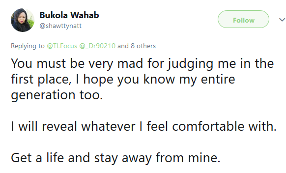 "I will reveal whatever I feel comfortable with. Get a life and stay away from mine," she wrote.