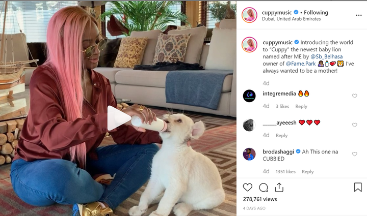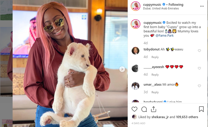 She announced that she was adopting her first child and posted pictures a few hours later of herself feeding a beautiful white lion with a caption, 'Introducing the world to "Cuppy", the newest baby lion named after me by @Sb_Belhasa owner of @Fame.Park. I have always wanted to be a Mother'.