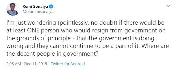 In a tweet the retired Professor of French and Linguistics shared, she wondered if there would be at least one person who would resign from Buhari's government on the grounds of principle. Remi Sonaiya also wondered where the decent people in government are.