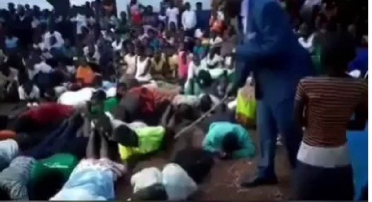 The Pastor identified as Paul Muwanguzi can holding a whip while he walked around his church members who were lying on the ground, flogging them before they went back to their seats.