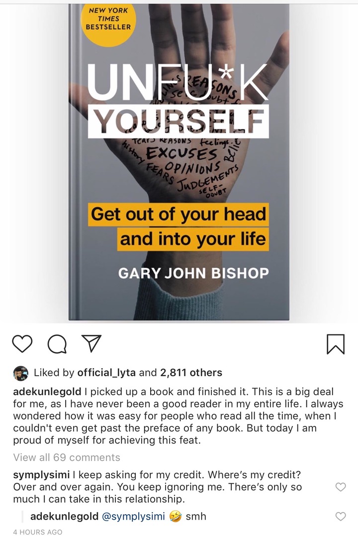 Adekunle Gold, who is a highlife singer, took to his Instagram handle on Sunday night to talk about the book ‘Unfu*k yourself’ by Gary John Bishop, which was the first book he has ever finished. His wife, Simi, responded to the post, by jokingly asking for credit.