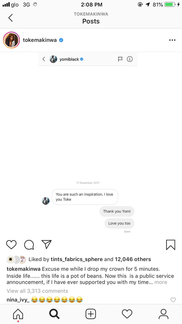 She took to her Instagram page and wrote, “Excuse me while I drop my crown for 5 minutes. Inside life .... .. this life is a pot of beans. Now this is a public service announcement, if I have ever supported you with my time, platform, money, and more pls don’t ever come for me.