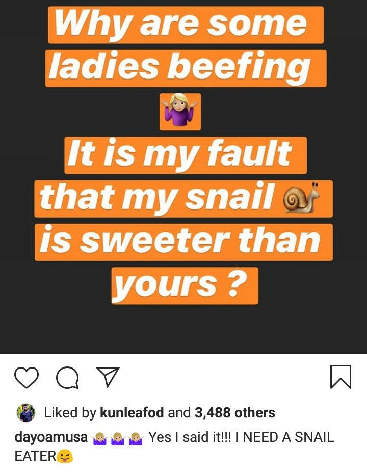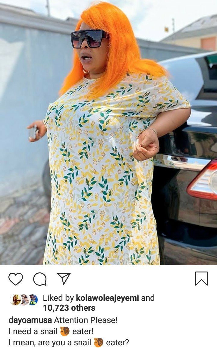 Dayo Amusa has gone on Instagram and Twitter to reveal that she’s in need of someone to eat her “snail”.
