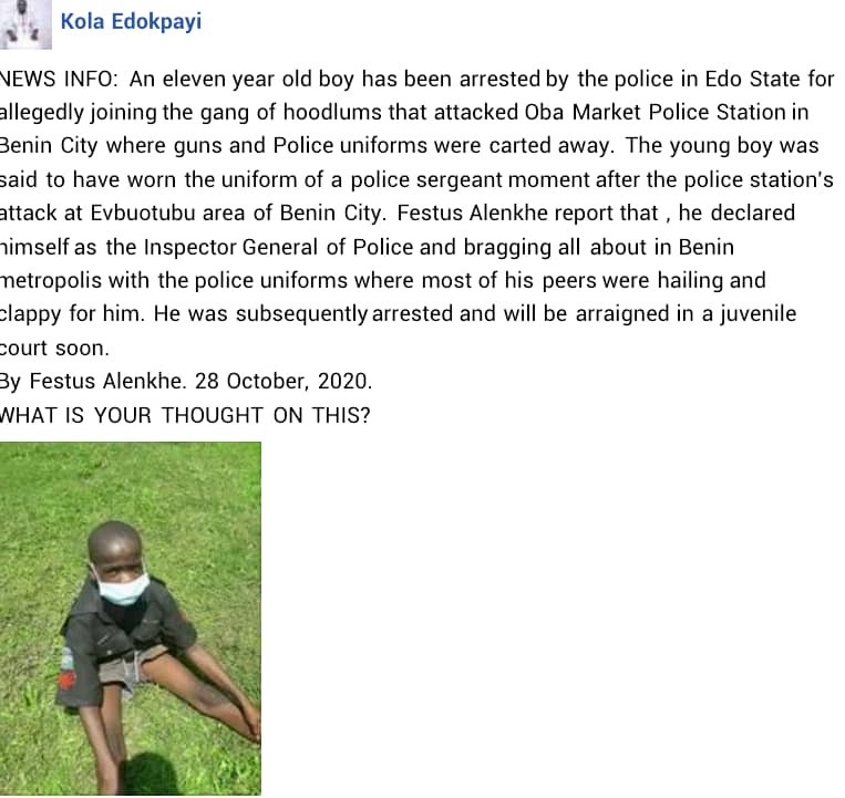 “We have been able to secure the unconditional release of the 11 year old boy by name Gift Osayuhi whose picture went viral on social media yesterday for allegedly joining some miscreants to break into Oba Market Police station, took their police Uniform,wore it and declared himself as the new IG of Police during the ENDSARS protest. The boy was released to us after we undertook to rehabilitate and reform him. The young boy said his dream is to become the IG of Police and we also undertook to ensure the boy is giving a proper education so as to help help him achieve his dream. We sincerely thank Edo State Commissioner of Police and Edo State Ministry of Justice for the kind understanding and cooperation. We also met with his mother who told she is a widow who takes care of the children alone and the little boy usually assist her to sell water and drinks in Ring Road”