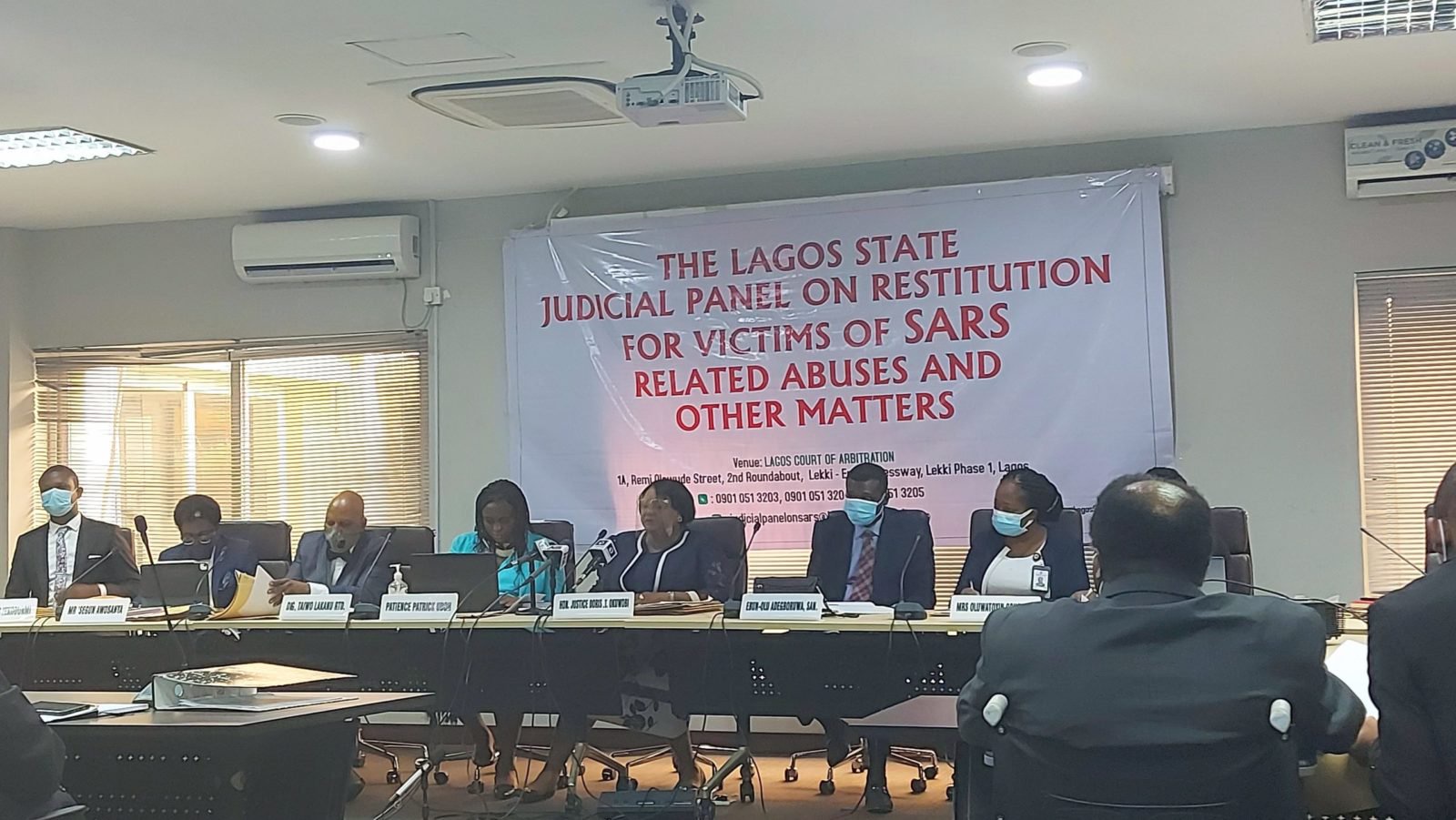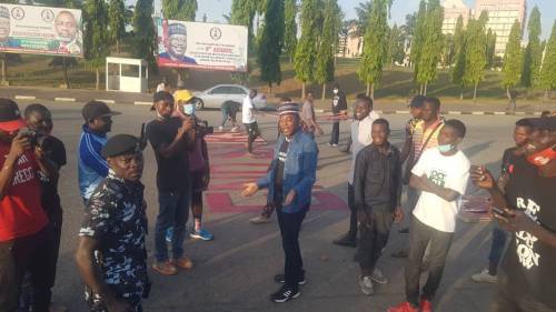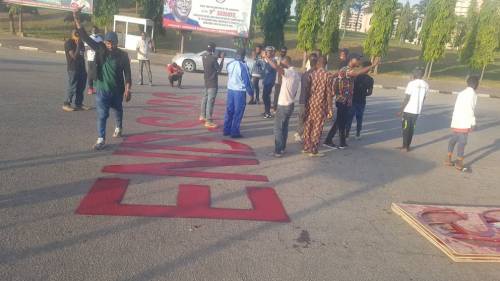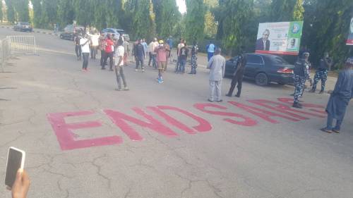 The demonstrators gathered in front of the complex to paint #ENDSARS grafiti on the floor to remind the Nigerian Government of their demands.