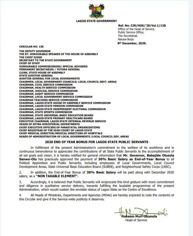 Lagos State Governor, Mr. Babajide Sanwo-Olu has approved 30% of basic salary as end of the year bonus for all public servants including state civil servants, political appointees, employees of Local Government Areas, Local Council Development Areas, State Universal Basic Education Board (SUBEB) and Neighborhood Safety Corps.