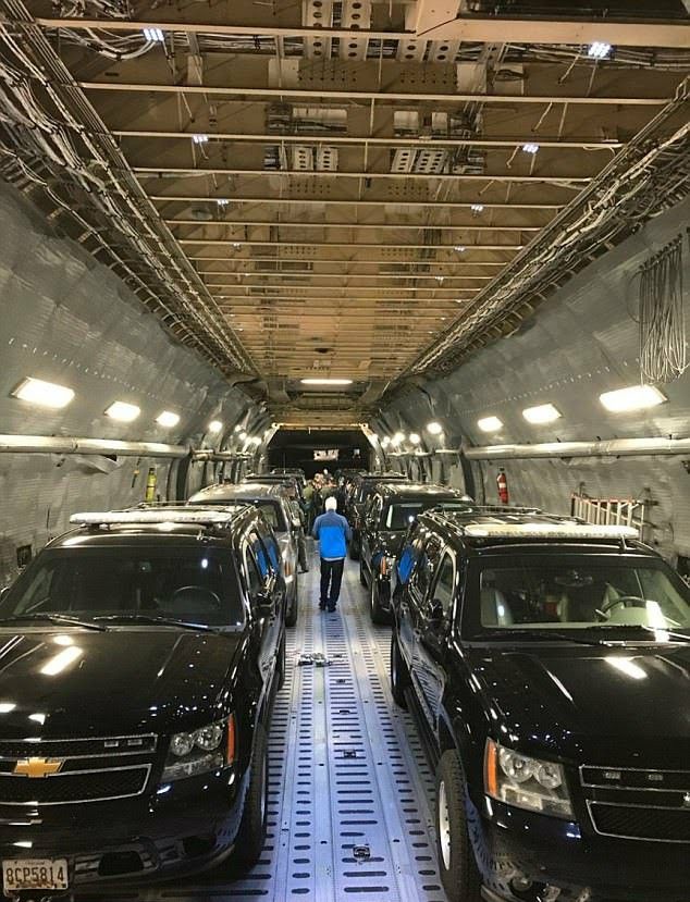 When the president flies overseas, the images depict how the presidential motorcade travels. The entire motorcade is loaded onto a Lockheed C- 5 galaxy, a massive transport plane with enough space for the entire procession. The motorcade, as seen in the pictures, has enough room for everyone and everything.