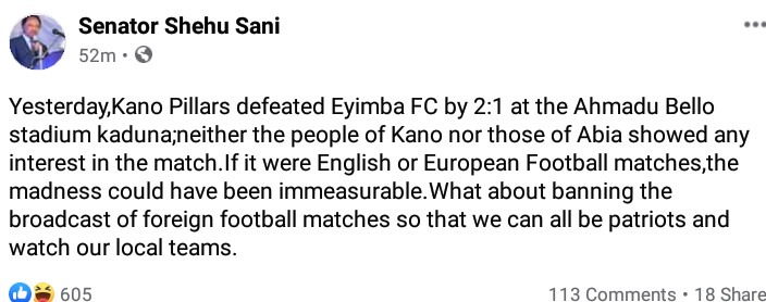 Senator Shehu Sani has made a suggestion to the federal government with regards to further promoting our Nigerian Professional Football League.